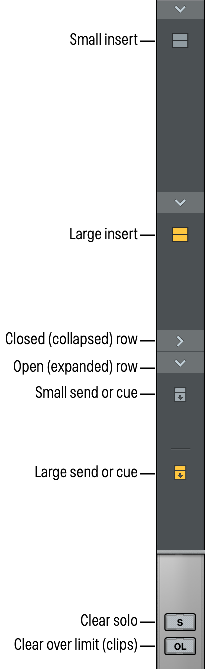 Note: Row switches and view options do not apply to Aux or Talkback channel strips. Aux and Talkback channel strips use context menus to change view options. See the Aux Returns and Talkback articles for more information.