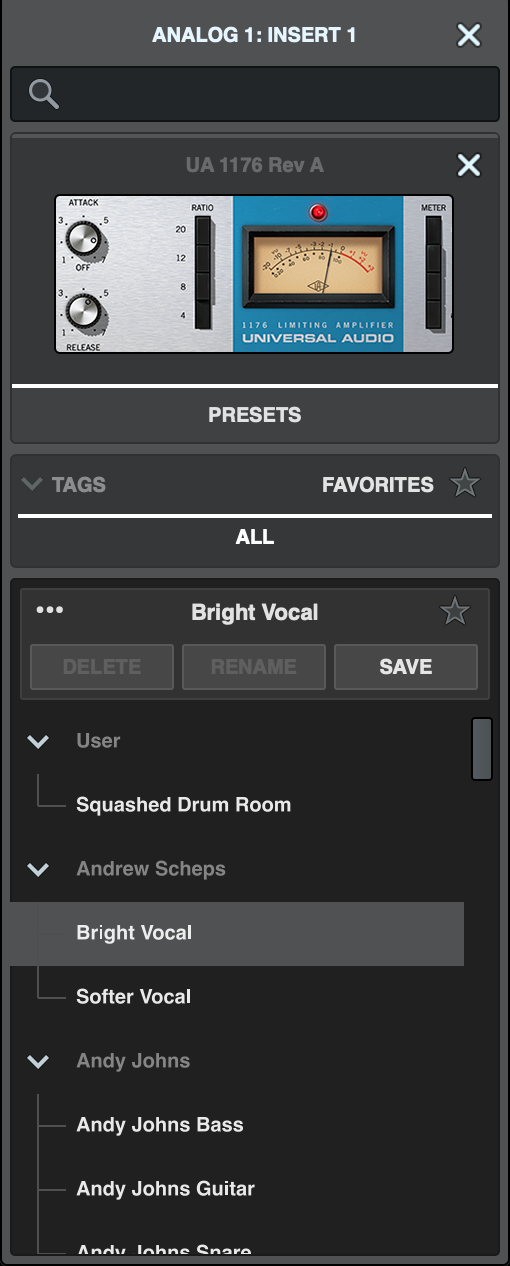 By default, UAD Console shows one Insert row, and expands to show an empty insert row each time an insert effect is added. For example, if you load insert slots into the first two slots, three rows are shown, and so on, until you reach the maximum of four insert slots.