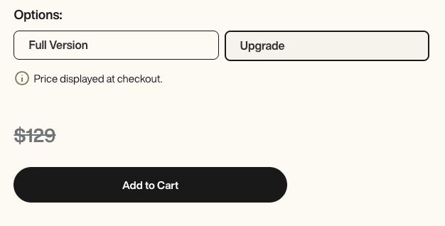 For some products, like bundles or plug-ins that have been significantly upgraded, you may see an upgrade price available if you own another product that qualifies you for the upgrade price. When special upgrade pricing is available to you, the product will have an “Upgrade Available” badge.