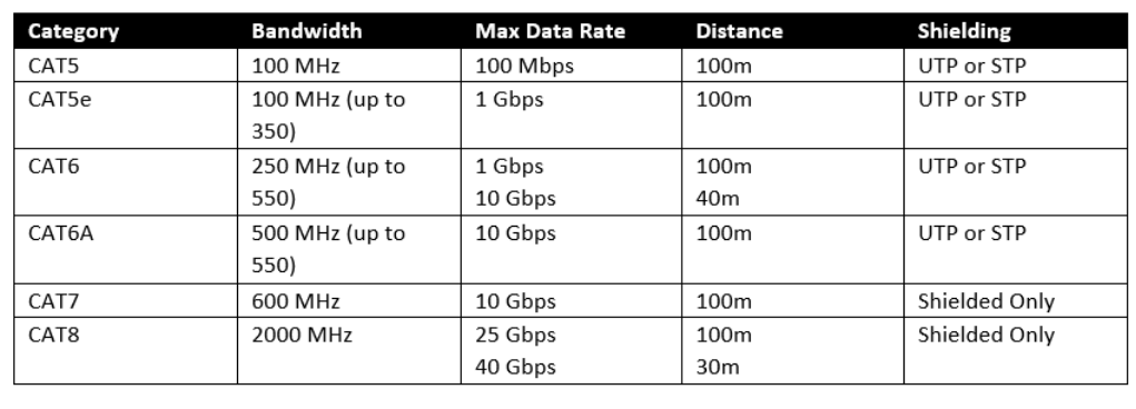 For a 1Gbps network connection, a Cat5e or better cable is required. Cables with higher specifications offer improved EMI/RFI rejection, and are capable of running over longer distances. Typically 1Gbps managed switches are used with Dante networks, so increasing the cable specifications will not increase data rates, but can help network resilience and futureproofing.