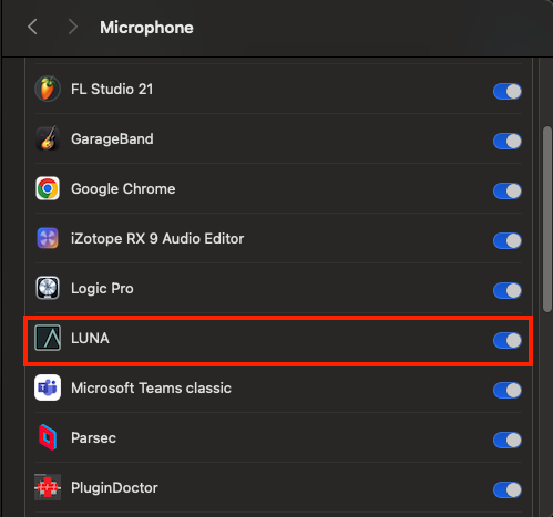 With macOS, all audio applications, including LUNA, must be allowed to access audio inputs (including internal and external microphones, and all audio inputs from audio interfaces).