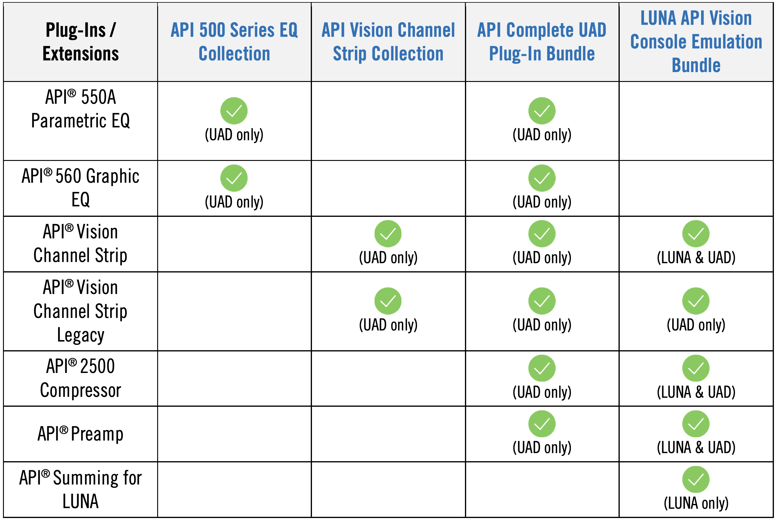 The following UAD Plug-ins and LUNA Extensions are included when purchasing any of the API Collection and Bundles listed below: