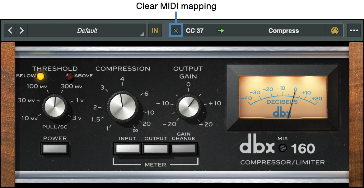 To clear a MIDI mapping, simply click MIDI Learn, click the control that is mapped in the plug-in, then click the X to the left of the CC.