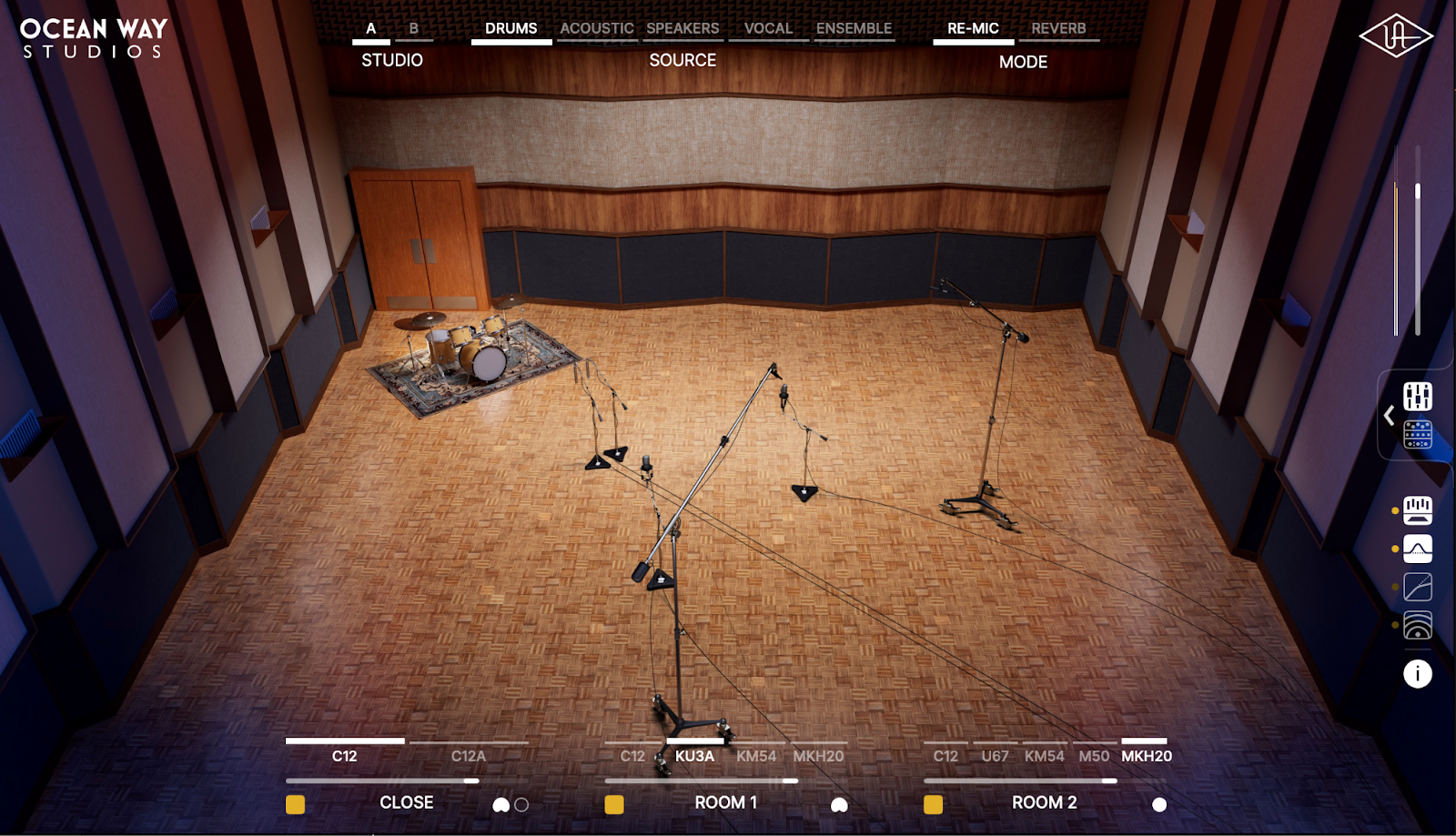 In addition to the studio room acoustics, the microphones used in the development of Ocean Way Studios Deluxe are a significant contributor to the tonality and fidelity of the plug-in.